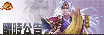 為了持續給各位帶來更優質的遊戲體驗,感受更多遊戲樂趣,《三國殺名將傳》將進行臨時維護,期間您將無法正常登入、儲值或登入遊戲,請各位主公互相轉告並在維護開始前提前登出遊戲,避免不必要的損失。